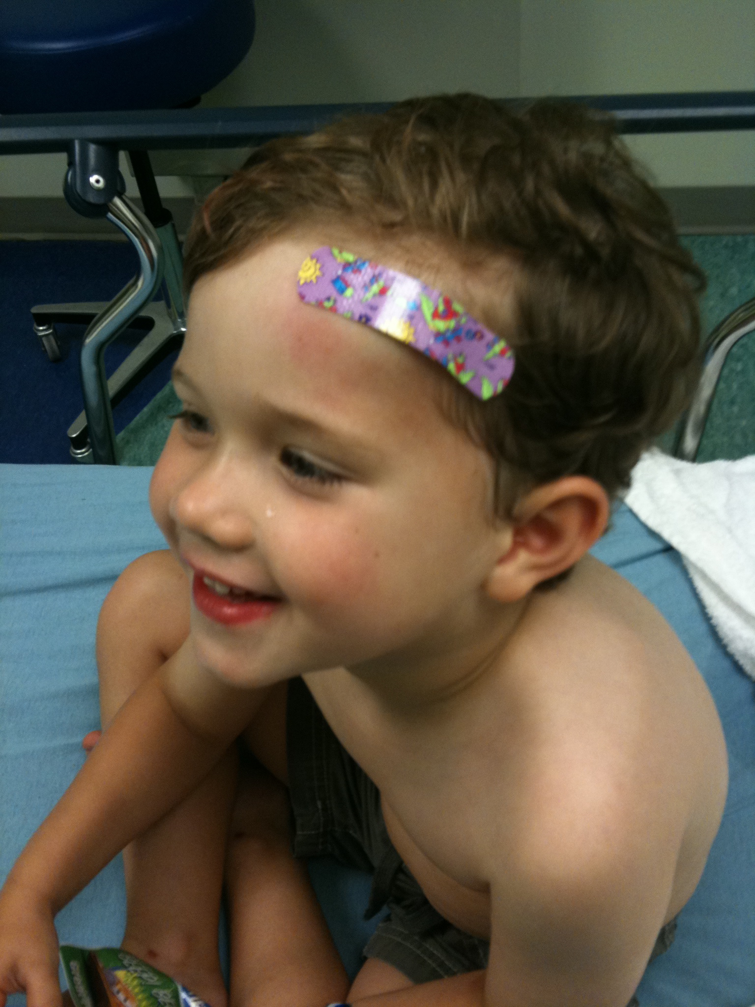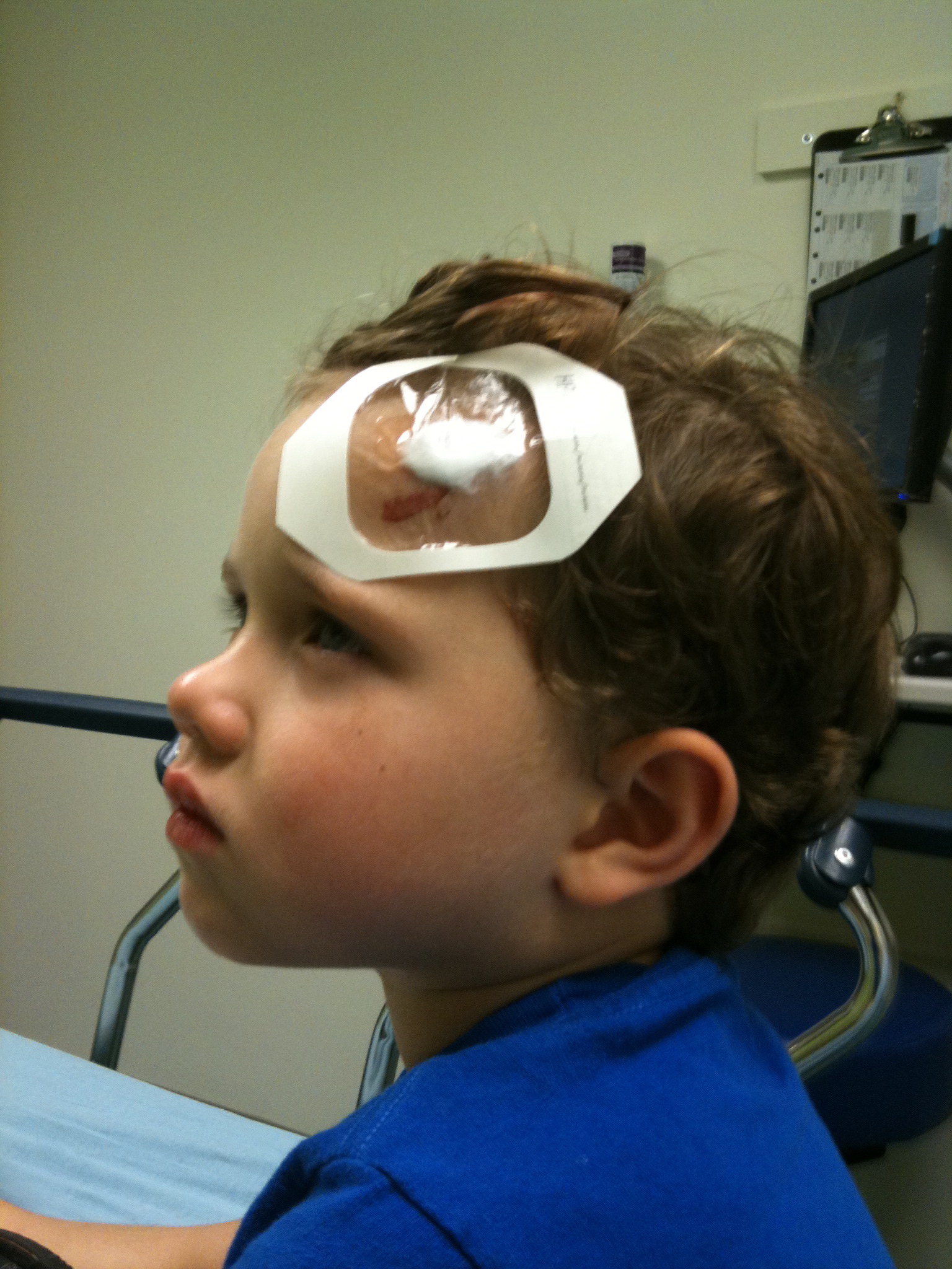We were taken back to a room quickly, and the little guy just sat quietly while they numbed his head, we waited, and they came back to stitch him up. For a bad looking cut that had a huge amount of blood, it only took 3 stitches.